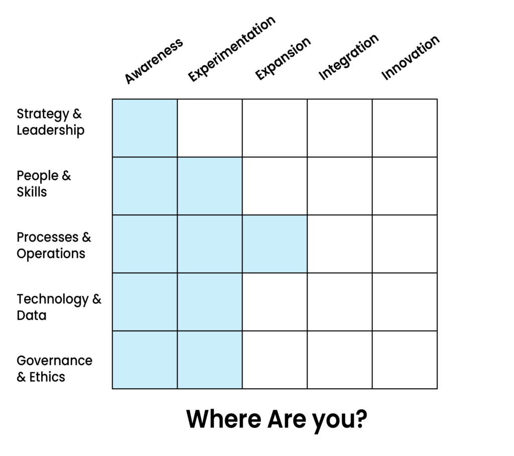 JPW has created a Maturity Model, from Awareness to Innovation, to help organizations assess their current state of AI adoption and define a clear path forward. The model highlights how organizations evolve in their use of AI across key dimensions including strategy and leadership, people and skills, processes and operations, technology and data, and governance and ethics.
